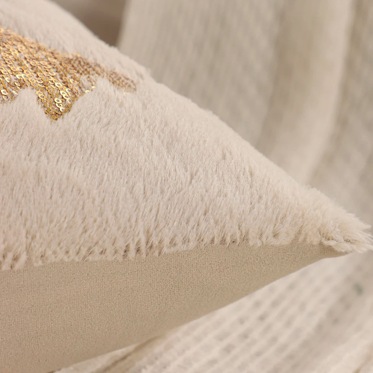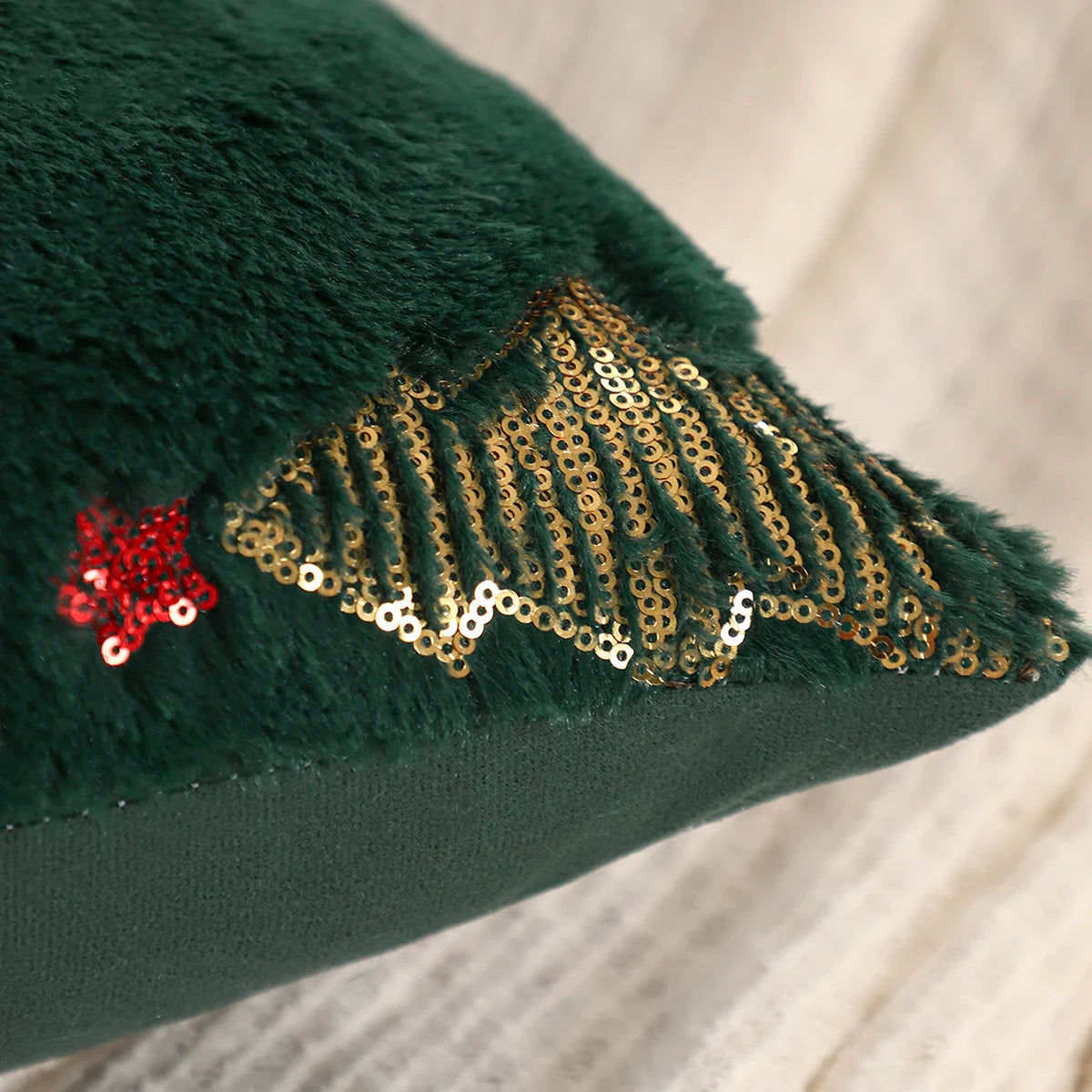 This luxurious plush pillow cover features stunning gold sequin Christmas trees with red sequin star toppers, bringing festive glamour to your living room.